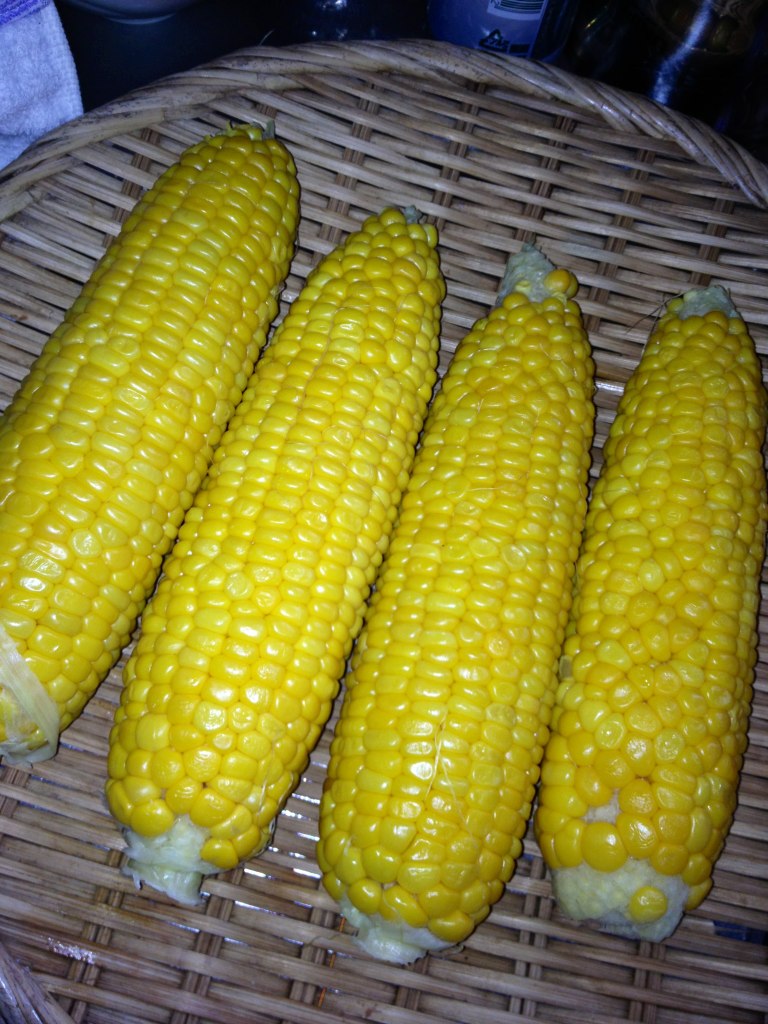 旬は外れてるけど、粒が大きくて甘〜いトウモロコシだったので、アサ坊のオヤツにしてあげた。