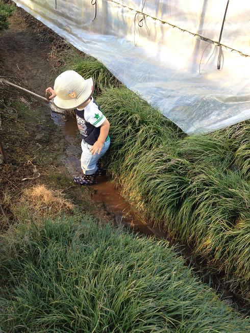 今日は 下のハウスの谷間で遊んでいたら、 坂の上から水が流れてきたよ!