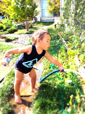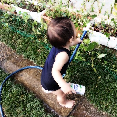 何も言わなかったのに、自分から グリーンカーテン用の朝顔に お水をやってました♪