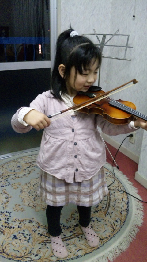 アコガレのバイオリンがやれる喜びと、初めてバイオリンを習う緊張とで、シィはやっぱり固い笑顔。