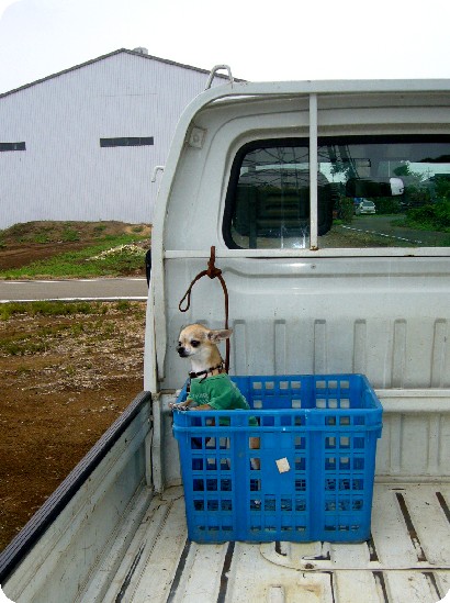 もぉー、ちょーかわいいんですけど! 軽トラからずっとお外を見ているよ。 一緒に竹取りしたかったのかな!?