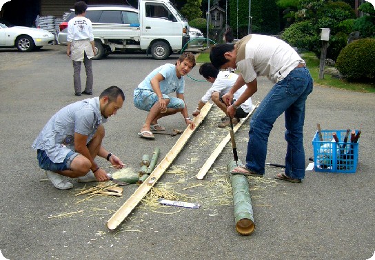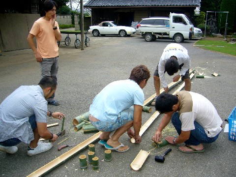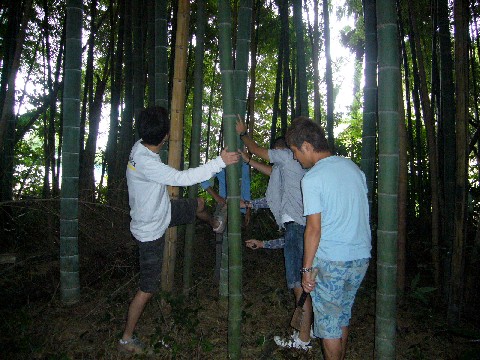 で、タダ流して食べるだけじゃおもしろくないからね、人数もいっぱいいることだし、竹の切り出しからやってもらいましたよ!