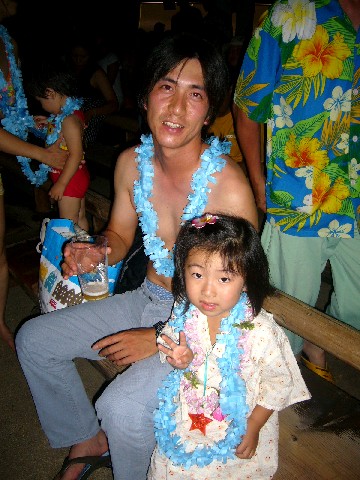 紙のレイもらって嬉しそう!