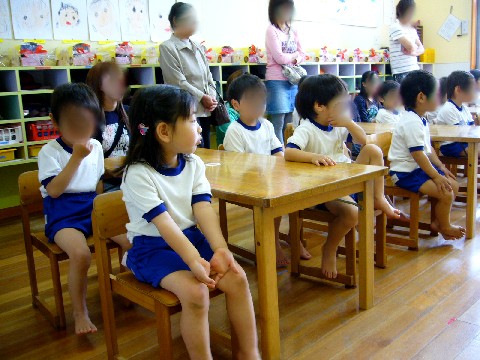 去年のクラス(2歳児クラス)では、 父兄の席はコドモのお隣だったので、子どもたちはママに抱っこされながらの参観でしたが。