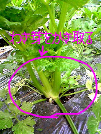 で、定植して1ヶ月くらい経つと セロリも大きくなって 本体の脇に ちょろちょろとわき芽が出てきちゃいます。