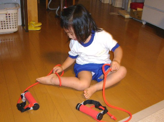 長いゴムをぐるぐる振り回して、必死にエクササイズやってますよー!