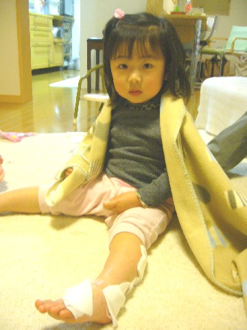 シャワーでジャージャー冷やし、チチ不在だったため 母屋のおばあちゃんに抱っこしててもらって 車を飛ばし、救急で診てくれる小児科に行って手当てしてもらい 一段落しましたが、足には何箇所も水ぶくれができてしまいました。